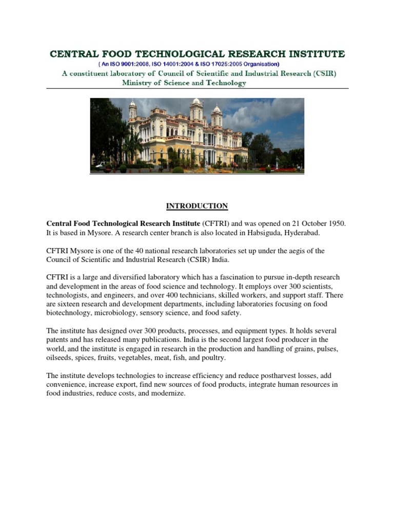INTRODUCTION Central Food Technological Research Institute (CFTRI) and was opened on 21 October 1950. It is based in Mysore.