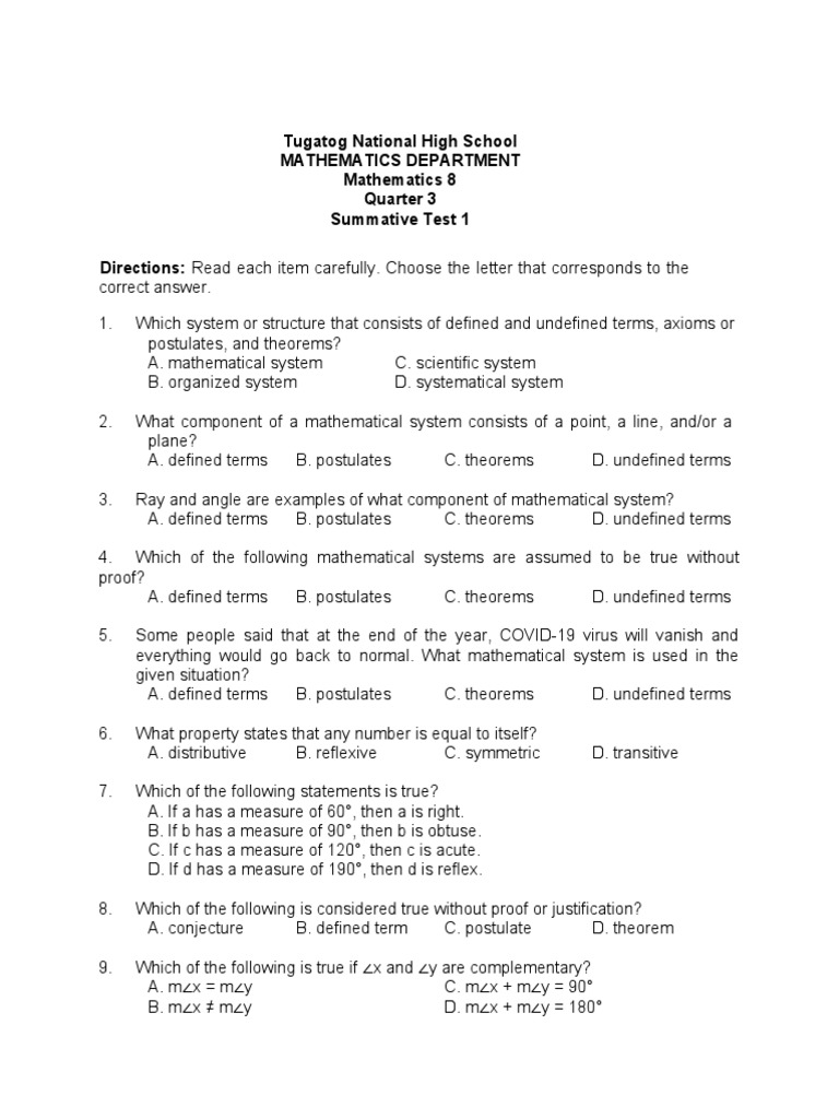 Directions: Read each item carefully. Choose the letter that corresponds to the