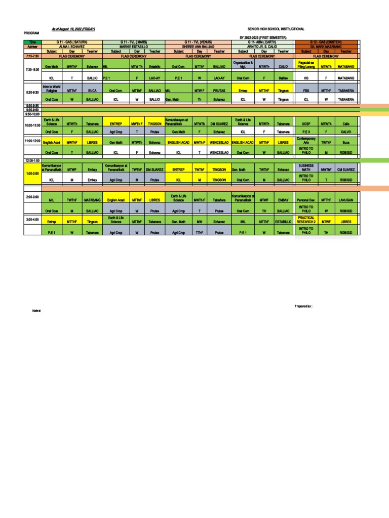 Entrep MTTHF Tingson Science MTThF Tabanera Gen. Math MW Echavez MIL MTThF ESTABILLO RESEARCH 2 MTWF LIBRES