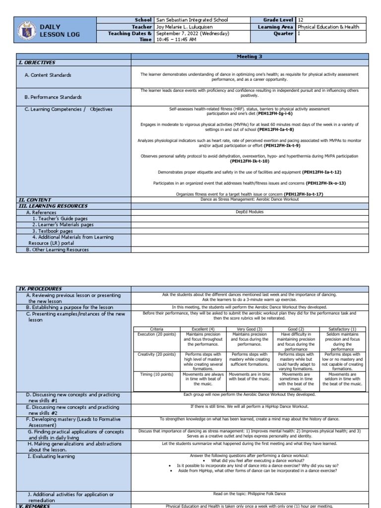 DAILY Teacher Joy Melanie L. Luluquisen Learning Area Physical Education & Health