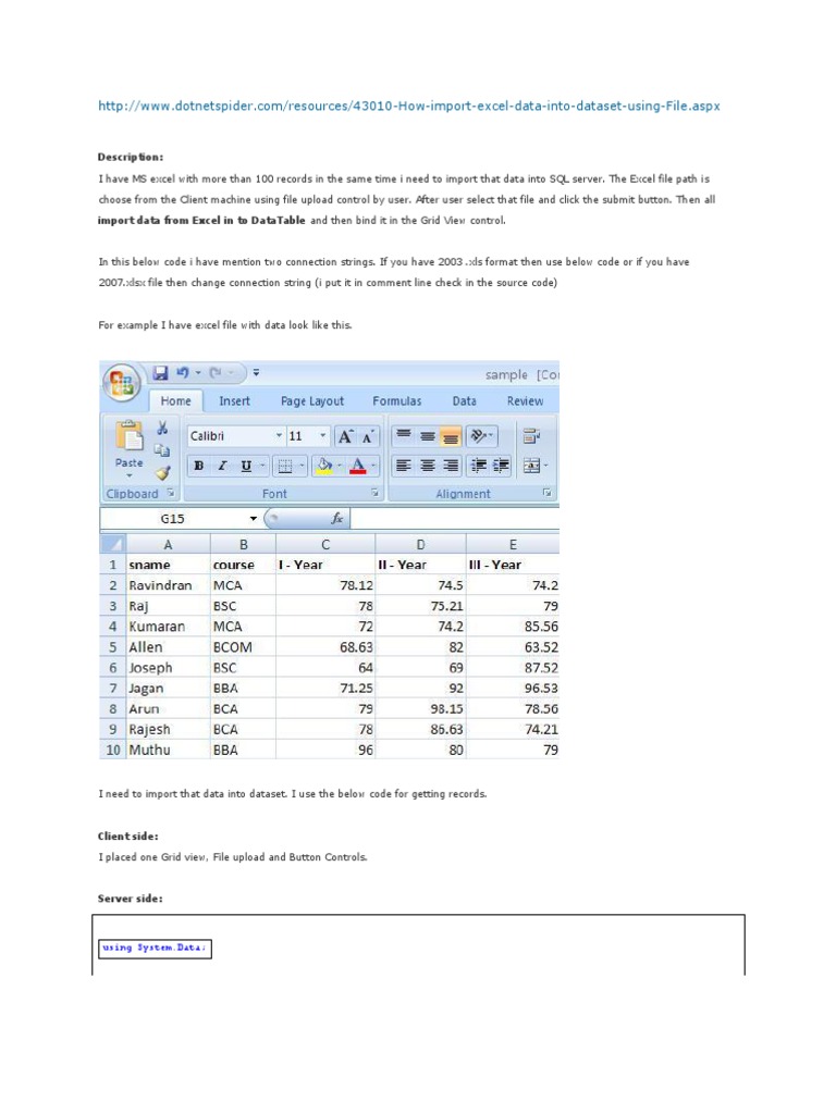 Source Code Detail: Here with I have attached source code download it and try to learn about import data from Excel To Dataset using C# and file upload control. Front End : ASP.NET Code Behind : C# Output: