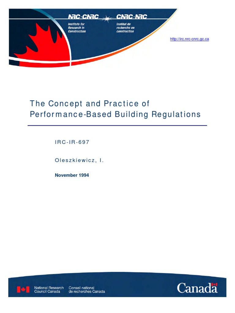 Preface This report is a brief summary of the research of the concepts involved in the performance-based building regulations, and their implementation in different countries. The research was conducted in anticipation of a similar transformation to take place in Canada. The selection of the countries was based on the fact that they have embarked on the transformation of their regulatory systems towards performance-based systems, and their legal framework and technological development are similar to those in Canada. Special attention was paid to the New Zealand reform, as it seems to be one that was executed in a very thougtful manner and because of the economical and political conditions at the time of the reform being relevant to the present Canadian situation. In reporting on New Zealand, an extensive use was made of the content of a paper by John Hunt, CEO of the New Zealand Building Industry Authority. The opinions expressed in this paper are those of the author and do not necessarily reflect the views of the Canadian Codes Centre or any of the Committees responsible for the National Building Code of Canada.