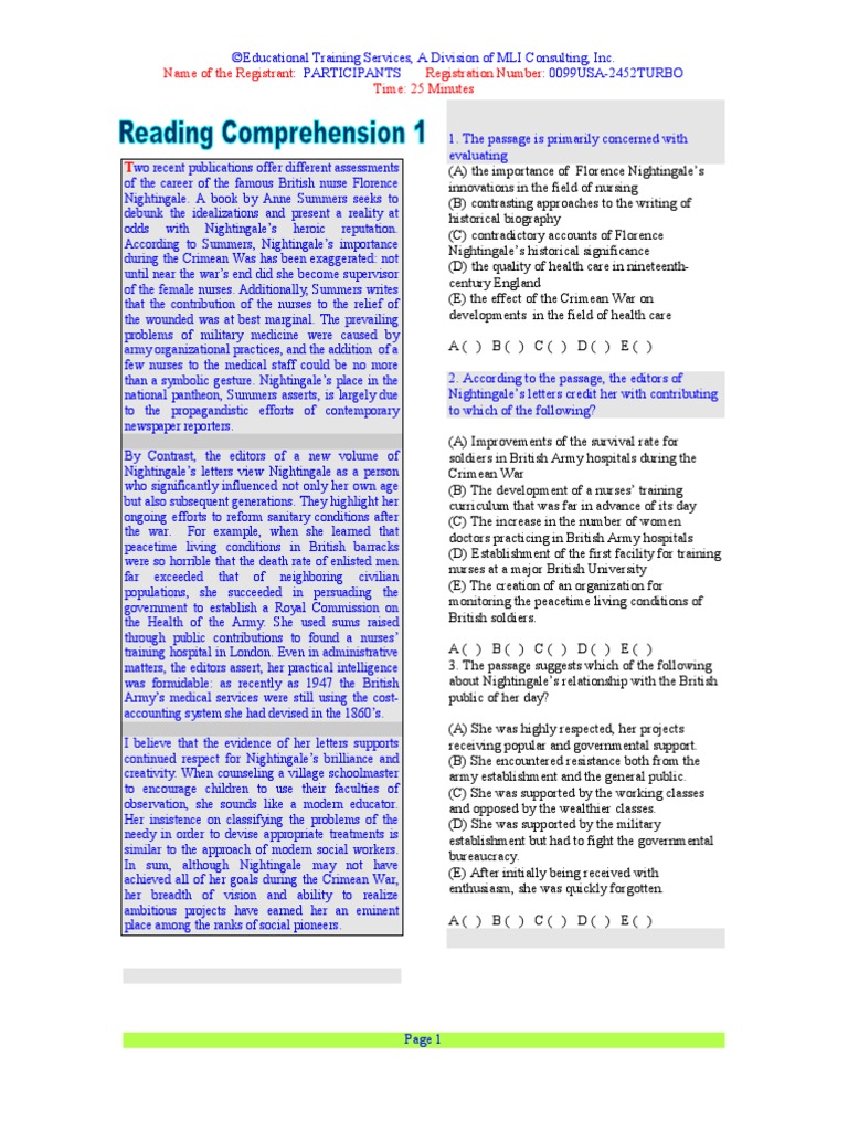 Educational Training Services, A Division of MLI Consulting, Inc. Name of the Registrant: PARTICIPANTS Registration Number: 0099USA-2452TURBO Time: 25 Minutes Two recent publications offer different assessments 4. The passage suggests which of the following of the career of the famous British nurse Florence Nightingale. A book by Anne Summers seeks to about sanitary conditions in Britain after the debunk the idealizations and present a reality at Crimean War? odds with Nightingales heroic reputation. According to Summers, Nightingales importance (A) While not ideal, they were superior to those during the Crimean Was has been exaggerated: not in other parts of the world. until near the wars end did she become supervisor (B) Compared with conditions before the war, of the female nurses. Additionally, Summers writes they had deteriorated. that the contribution of the nurses to the relief of (C) They were more advanced in rural areas than the wounded was at best marginal. The prevailing in urban centers. problems of military medicine were caused by (D) They were worse in military camps than in army organizational practices, and the addition of a the neighboring civilian populations. few nurses to the medical staff could be no more (E) They were uniformly crude and than a symbolic gesture. Nightingales place in the unsatisfactory throughout England. national pantheon, Summers asserts, is largely due to the propagandistic efforts of contemporary A( ) B( ) C( ) D( ) E( ) newspaper reporters.