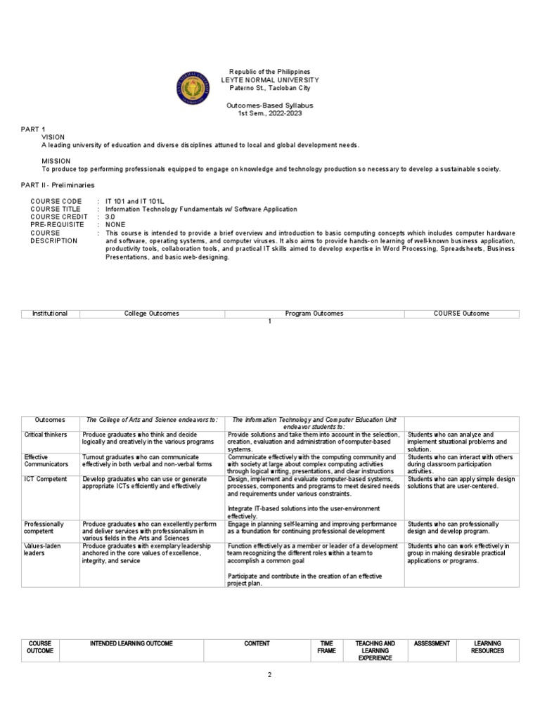 Outcomes The College of Arts and Science endeavors to: The Information Technology and Computer Education Unit