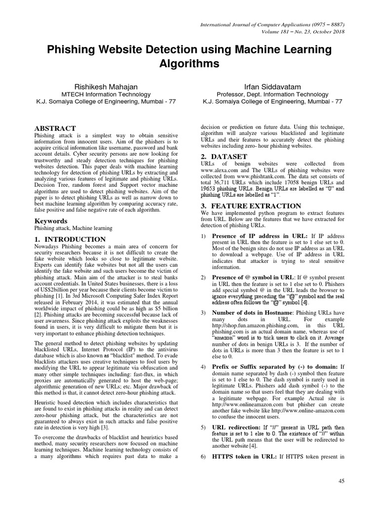 Phishing attack, Machine learning detection of phishing URLs.