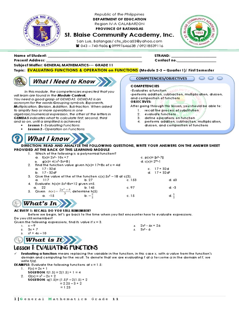 Topic: EVALUATING FUNCTIONS & OPERATION on FUNCTIONS (Module 2-3 – Quarter 1)/ First Semester