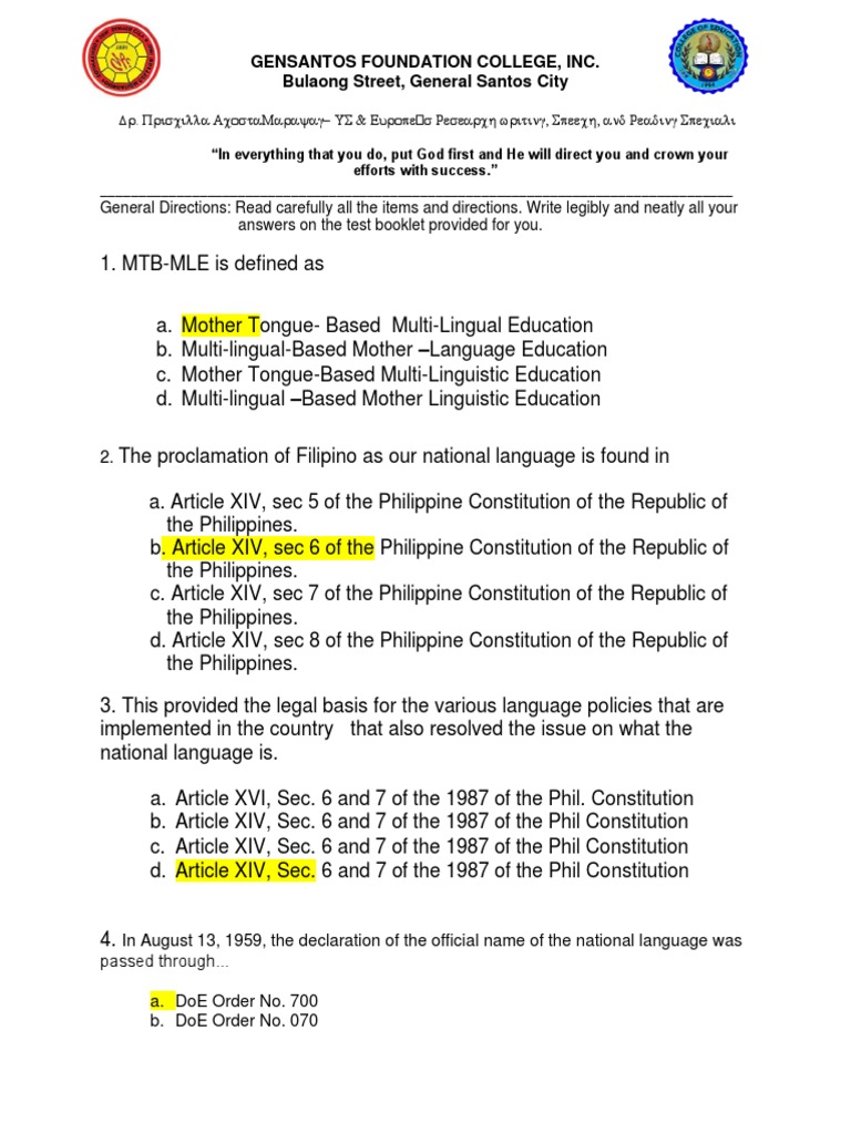 c. Article XIV, sec 7 of the Philippine Constitution of the Republic of