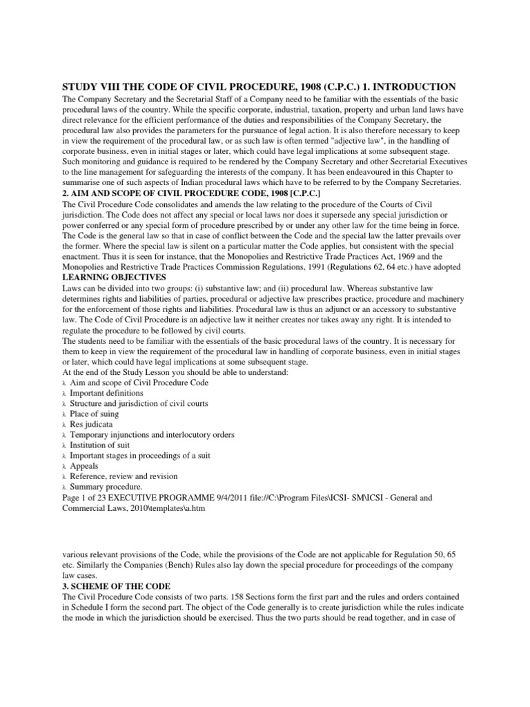 The Company Secretary and the Secretarial Staff of a Company need to be familiar with the essentials of the basic procedural laws of the country. While the specific corporate, industrial, taxation, property and urban land laws have direct relevance for the efficient performance of the duties and responsibilities of the Company Secretary, the procedural law also provides the parameters for the pursuance of legal action. It is also therefore necessary to keep in view the requirement of the procedural law, or as such law is often termed "adjective law", in the handling of corporate business, even in initial stages or later, which could have legal implications at some subsequent stage. Such monitoring and guidance is required to be rendered by the Company Secretary and other Secretarial Executives to the line management for safeguarding the interests of the company. It has been endeavoured in this Chapter to summarise one of such aspects of Indian procedural laws which have to be referred to by the Company Secretaries. 2. AIM AND SCOPE OF CIVIL PROCEDURE CODE, 1908 [C.P.C.] The Civil Procedure Code consolidates and amends the law relating to the procedure of the Courts of Civil jurisdiction. The Code does not affect any special or local laws nor does it supersede any special jurisdiction or power conferred or any special form of procedure prescribed by or under any other law for the time being in force. The Code is the general law so that in case of conflict between the Code and the special law the latter prevails over the former. Where the special law is silent on a particular matter the Code applies, but consistent with the special enactment. Thus it is seen for instance, that the Monopolies and Restrictive Trade Practices Act, 1969 and the Monopolies and Restrictive Trade Practices Commission Regulations, 1991 (Regulations 62, 64 etc.) have adopted LEARNING OBJECTIVES Laws can be divided into two groups: (i) substantive law; and (ii) procedural law. Whereas substantive law determines rights and liabilities of parties, procedural or adjective law prescribes practice, procedure and machinery for the enforcement of those rights and liabilities. Procedural law is thus an adjunct or an accessory to substantive law. The Code of Civil Procedure is an adjective law it neither creates nor takes away any right. It is intended to regulate the procedure to be followed by civil courts. The students need to be familiar with the essentials of the basic procedural laws of the country. It is necessary for them to keep in view the requirement of the procedural law in handling of corporate business, even in initial stages or later, which could have legal implications at some subsequent stage. At the end of the Study Lesson you should be able to understand: Aim and scope of Civil Procedure Code Important definitions Structure and jurisdiction of civil courts Place of suing Res judicata Temporary injunctions and interlocutory orders Institution of suit Important stages in proceedings of a suit Appeals Reference, review and revision Summary procedure. Page 1 of 23 EXECUTIVE PROGRAMME 9/4/2011 file://C:\Program Files\ICSI- SM\ICSI - General and Commercial Laws, 2010\templates\a.htm