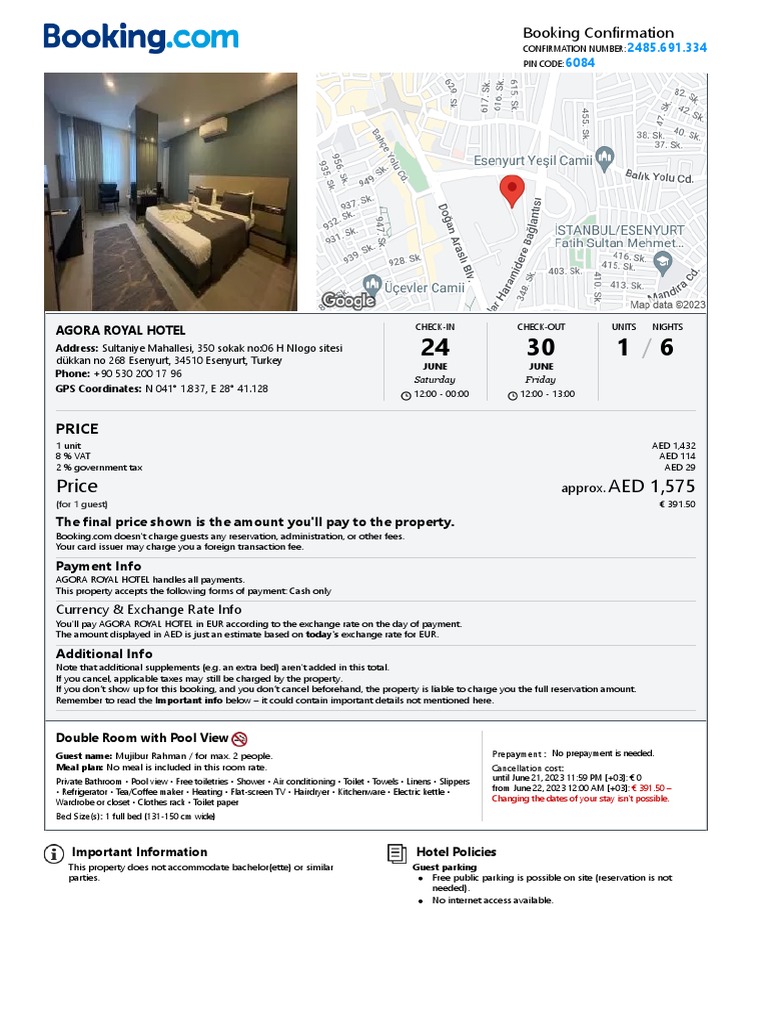 Guest name: Mujibur Rahman / for max. 2 people. Prepayment : No prepayment is needed.