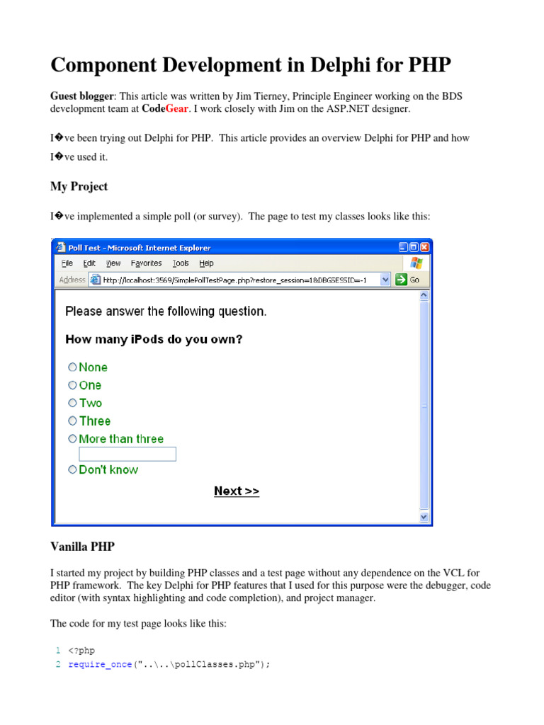 Once my test page was working, I was ready to wrap my poll classes in a VCL for PHP component.