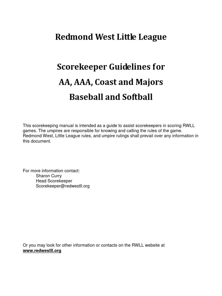 This scorekeeping manual is intended as a guide to assist scorekeepers in scoring RWLL