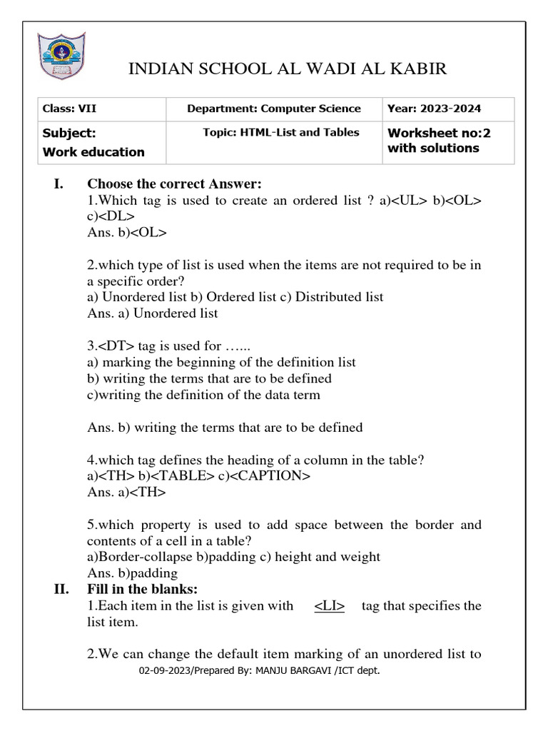 Subject: Topic: HTML-List and Tables Worksheet no:2