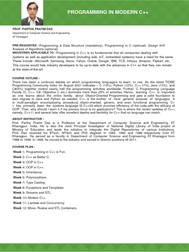 This course would help industry developers to be up-to-date with the advances in C++ so that they can remain