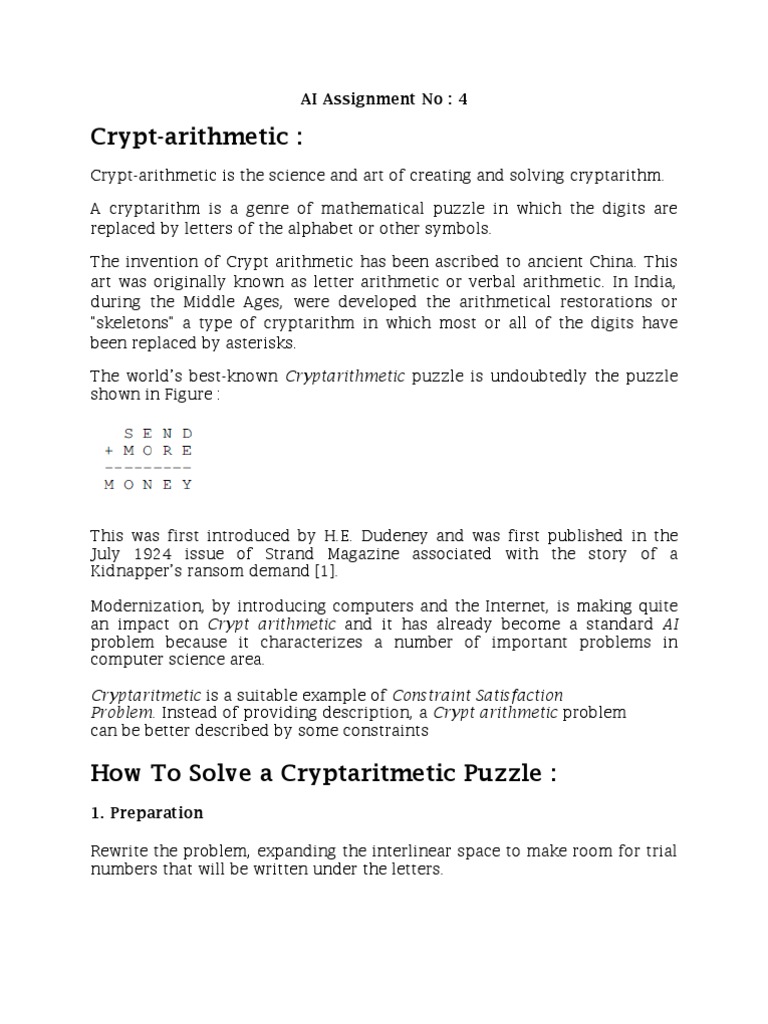 This was first introduced by H.E. Dudeney and was first published in the July 1924 issue of Strand Magazine associated with the story of a Kidnappers ransom demand [1]. Modernization, by introducing computers and the Internet, is making quite an impact on Crypt arithmetic and it has already become a standard AI problem because it characterizes a number of important problems in computer science area. Cryptaritmetic is a suitable example of Constraint Satisfaction Problem. Instead of providing description, a Crypt arithmetic problem can be better described by some constraints