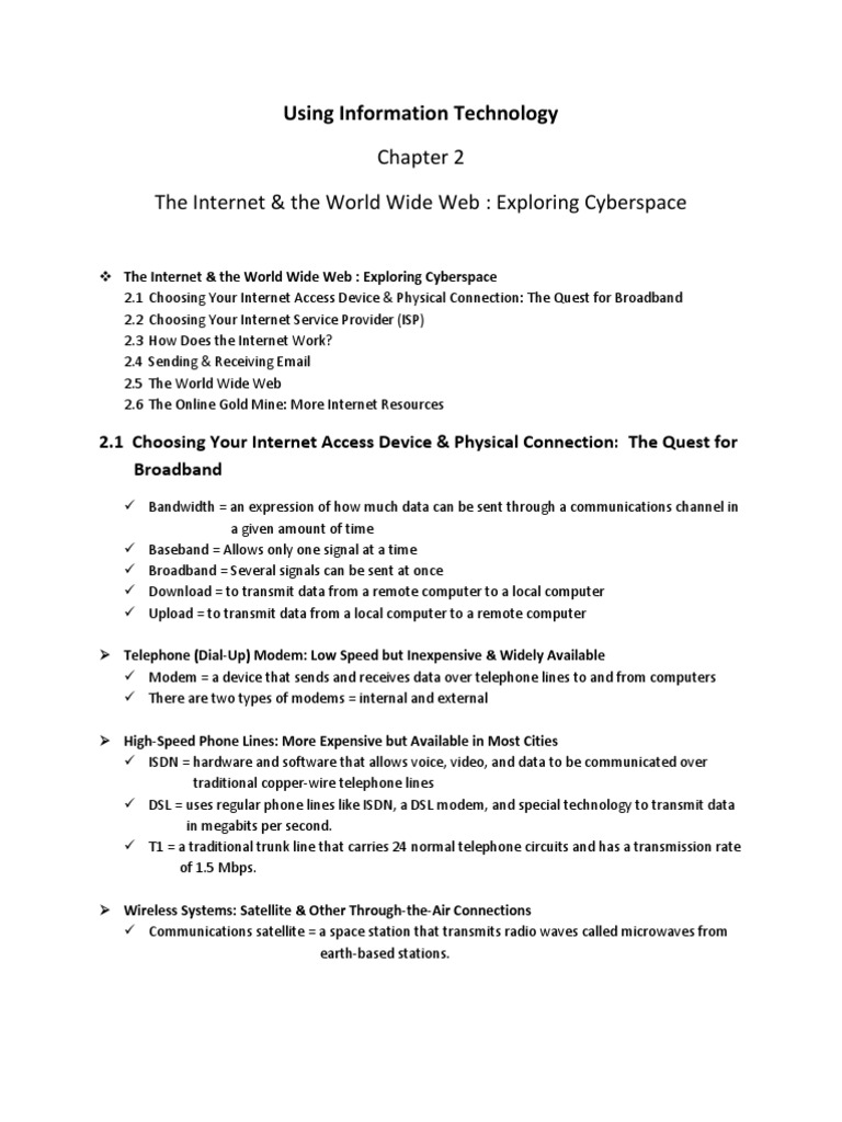 The Internet & the World Wide Web : Exploring Cyberspace 2.1 Choosing Your Internet Access Device & Physical Connection: The Quest for Broadband 2.2 Choosing Your Internet Service Provider (ISP) 2.3 How Does the Internet Work? 2.4 Sending & Receiving Email 2.5 The World Wide Web 2.6 The Online Gold Mine: More Internet Resources