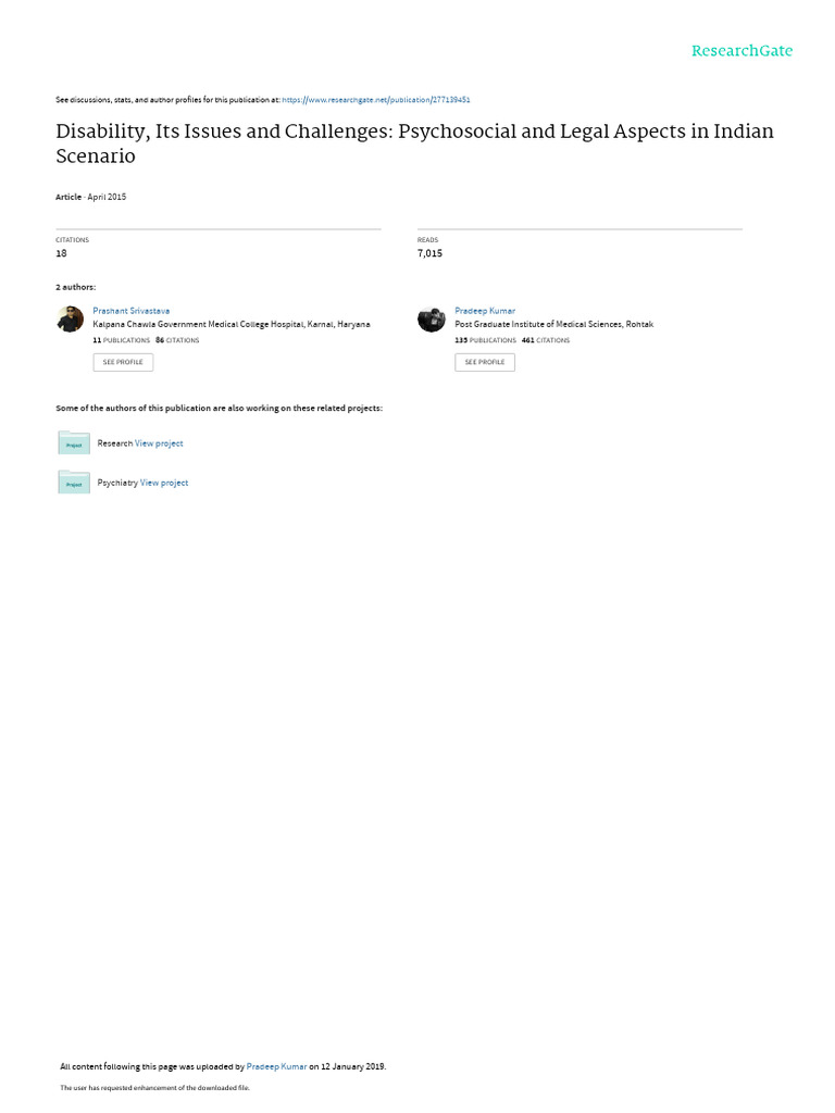 Disability, Its Issues and Challenges: Psychosocial and Legal Aspects in Indian