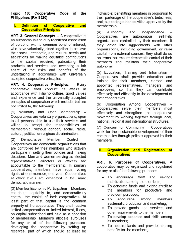 I. Definition of Cooperative and membership.