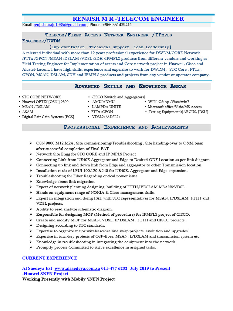 Alcatel-Lucent. I have high skills, experience and expertise to work for DWDM , STC Core , FTTx ,