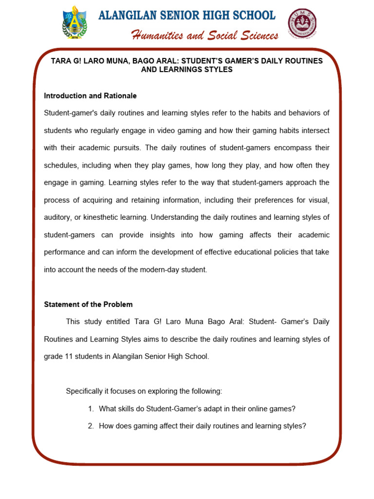 This study entitled Tara G! Laro Muna Bago Aral: Student- Gamer’s Daily