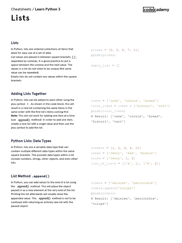 In Python, lists can be added to each other using the items = ['cake', 'cookie', 'bread']