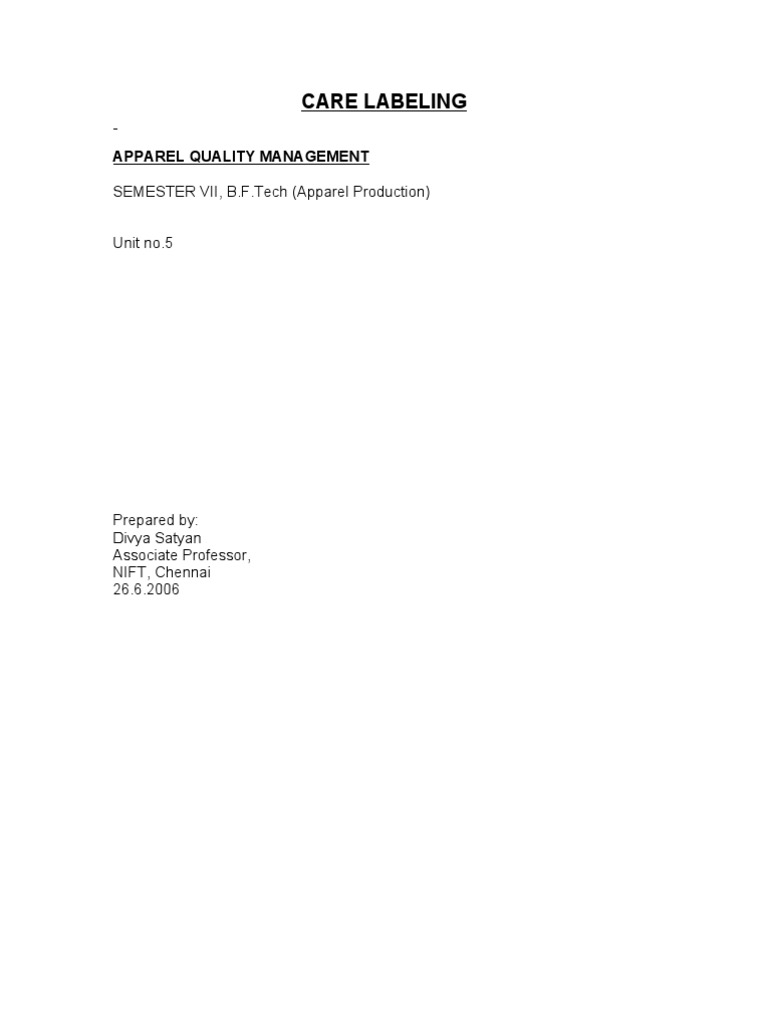 Care Labeling Reference Manual Need for care labels. Care labels indicate how to clean textile articles in the best possible way. Care symbols provide all the necessary information on washing, bleaching, ironing, dry cleaning and tumble drying. Without this information, the consumer will face trouble in deciding on the appropriate care treatment of the textile item because it does not depend on the main fabric solely. Indeed, all the components of the textile need be taken into account: other fibers, accessories, but also dying, finishing treatments and texture. Using care labels provides the consumer with care information he does not have to decide on. The consumer usually does not have the experience or technical knowledge to decide which care treatment is suitable. Care labeling is determined under the responsibility of the garment maker in common interest of textile manufacturers, drycleaners and of course consumers. Thus care symbols are recommendations on how to clean a textile article on which they are affixed; they should not be considered as a use guaranty neither as a quality mark. Symbols refer to maximum permissible treatments that a textile article can bear without irreversible damage. More severe treatments can always be applied. Care labels often are a deciding factor when consumers shop for clothing. While some consumers look for the convenience of dry-cleaning, others prefer the economy of washable garments. In fact, recent surveys show that consumers want washing instructions on their purchases Who needs to label and What needs labeling The Care Labeling Rule requires manufacturers and importers to attach care instructions to clothing and some piece goods. Thus, the following categories of people/organizations need to be aware of the use the care labels