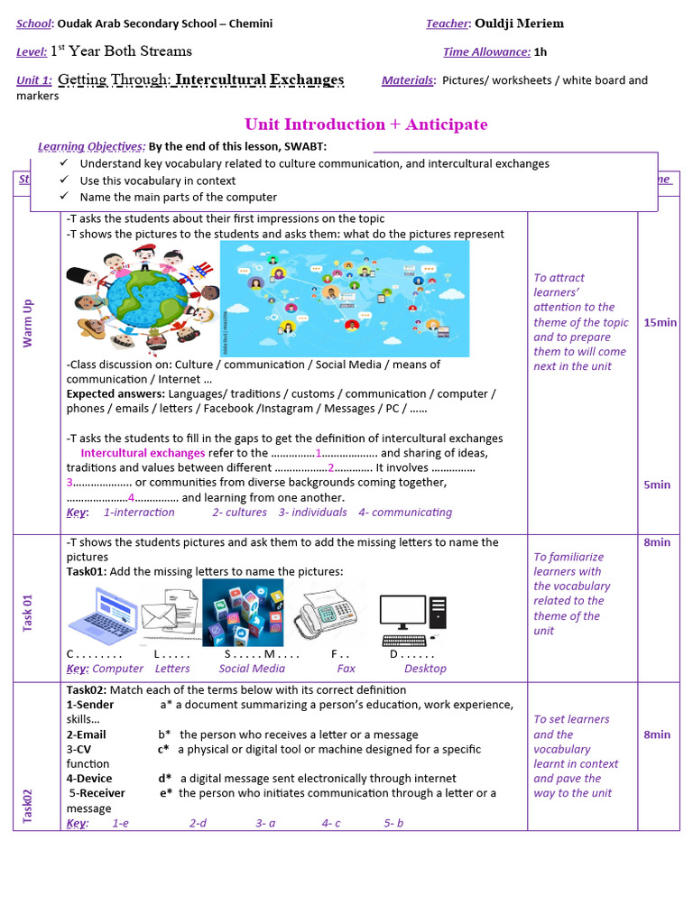 Unit 1: Getting Through: Intercultural Exchanges Materials: Pictures/ worksheets / white board and