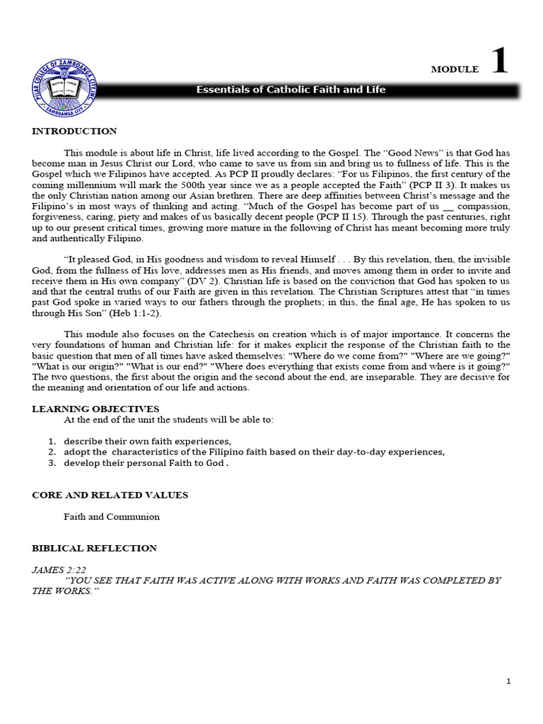 This module also focuses on the Catechesis on creation which is of major importance. It concerns the