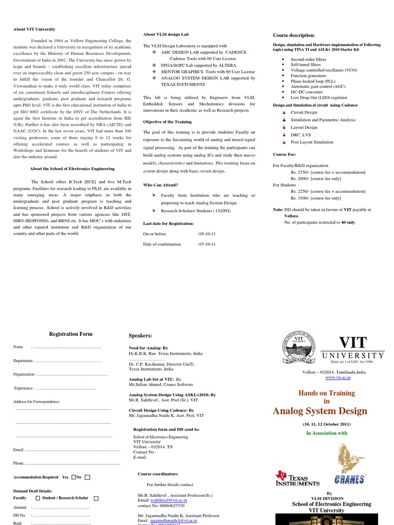 declared a University in recognition of its academic excellence by the Ministry of Human Resources Development, Government of India in 2001. The University has since grown by leaps and bounds establishing excellent infrastructure spread over an impeccacably clean and green 250 acre campus - on way to fulfill the vision of the founder and Chancellor Dr. G. Viswanathan to make it truly world class. VIT today comprises of six constituent Schools and interdisciplinary Centers offering undergraduate, graduate, post graduate and research programs upto PhD level. VIT is the first educational institution of India to get ISO 9002 certificate by the DNV of The Netherlands. It is again the first Institute in India to get accreditation from IEE (UK). Further it has also been accredited by NBA (AICTE) and NAAC (UGC). In the last seven years, VIT had more than 100 visiting professors, some of them staying 6 to 12 weeks for offering accelerated courses as well as participating in Workshops and Seminars for the benefit of students of VIT and also the industry around. About the School of Electronics Engineering The School offers B.Tech [ECE] and five M.Tech programs. Facilities for research leading to Ph.D. are available in many emerging areas. A major emphasis in both the undergraduate and post graduate program is teaching and learning process. School is actively involved in R&D activities and has sponsored projects from various agencies like DST, ISRO (RESPOND), and BRNS etc. It has MOUs with industries and other reputed institution and R&D organization of our country and other parts of the world. The VLSI Design Laboratory is equipped with ASIC DESIGN LAB supported by CADENCE Cadence Tools with 60 User License FPGA/SOPC Lab supported by ALTERA MENTOR GRAPHICS Tools with 60 User License ANALOG SYSTEM DESIGN LAB supported by TEXAS INSTUMENTS This lab is being utilized by Engineers from VLSI, Embedded, Sensors and Mechatronics divisions for innovations in their Academic as well as Research projects. Objective of the Training The goal of this training is to provide students/ Faculty an exposure to the fascinating world of analog and mixed-signal signal processing. As part of the training the participants can build analog systems using analog ICs and study their macro models, characteristics and limitations. This training focus on system design along with basic circuit design. Who Can Attend? Faculty from Institution who are teaching or proposing to teach Analog System Design Research Scholars/ Students ( UG/PG) Last date for Registration: On or before Date of confirmation : 05-10-11 : 07-10-11 Note: DD should be taken in favour of VIT payable at Vellore. No. of participants restricted to 40 only. Course Fee: For Faculty/R&D organization Rs. 2750/- [course fee + accommodation] Rs. 2000/- [course fee only] For Students Rs. 2250/- [course fee + accommodation] Rs. 1500/- [course fee only]