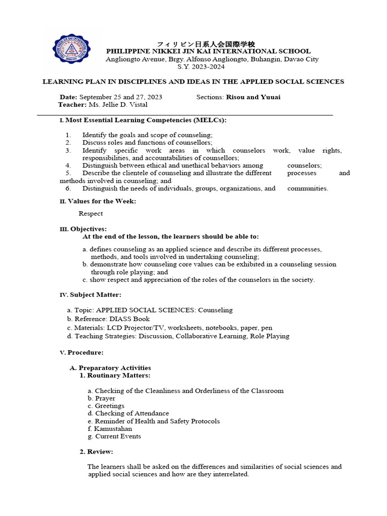 a. Topic: APPLIED SOCIAL SCIENCES: Counseling