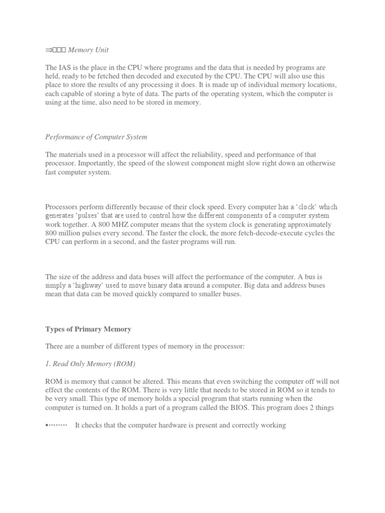 by programs are held, ready to be fetched then decoded and executed by the CPU. The CPU will also use this place to store the results of any processing it does. It is made up of individual memory locations, each capable of storing a byte of data. The parts of the operating system, which the computer is using at the time, also need to be stored in memory.