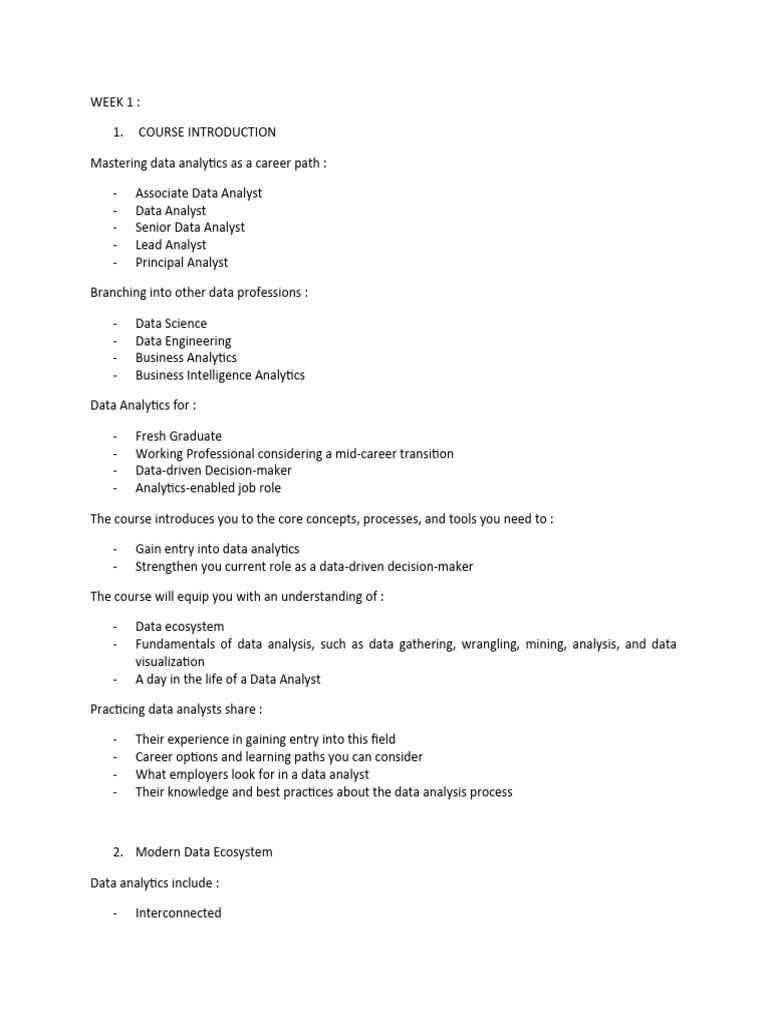 - Fundamentals of data analysis, such as data gathering, wrangling, mining, analysis, and data