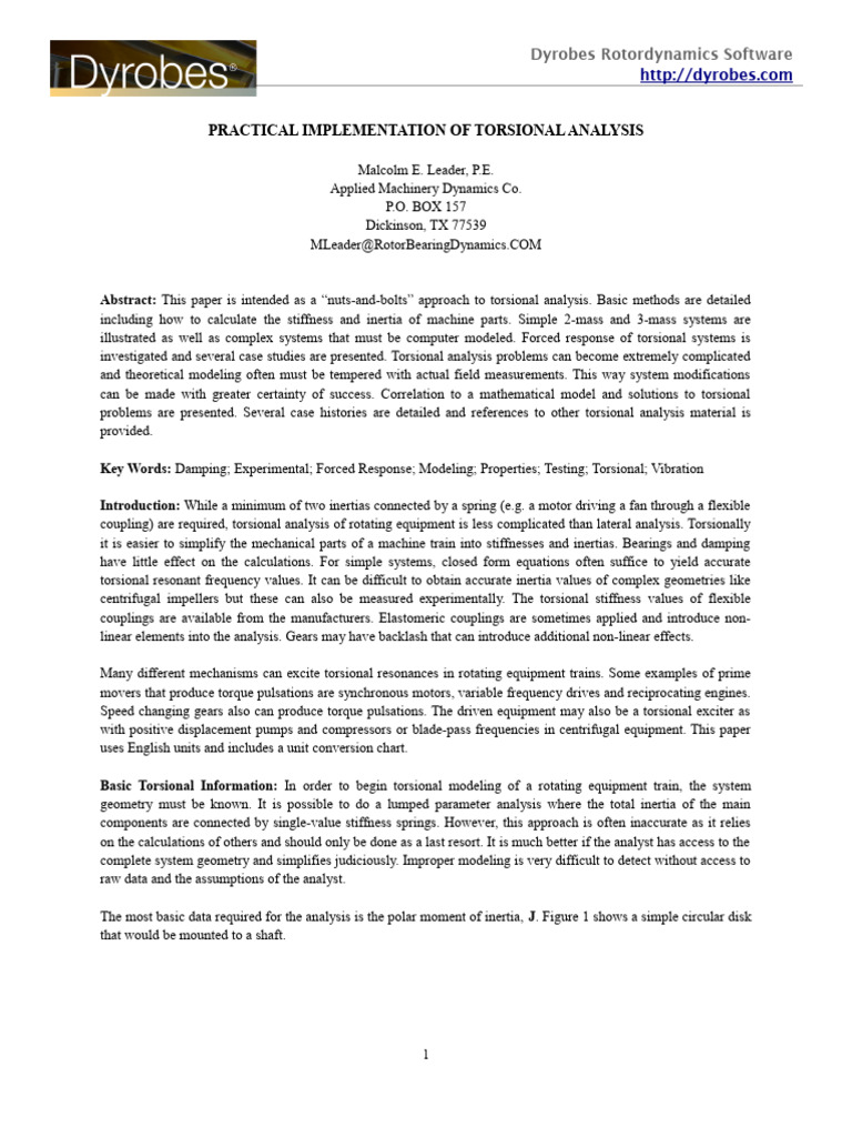 Abstract: This paper is intended as a “nuts-and-bolts” approach to torsional analysis. Basic methods are detailed