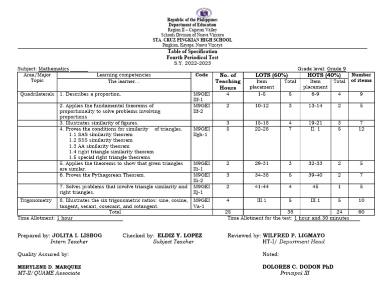 Time Allotment: 1 hour Time Allotment for the test: 1 hour and 30 minutes