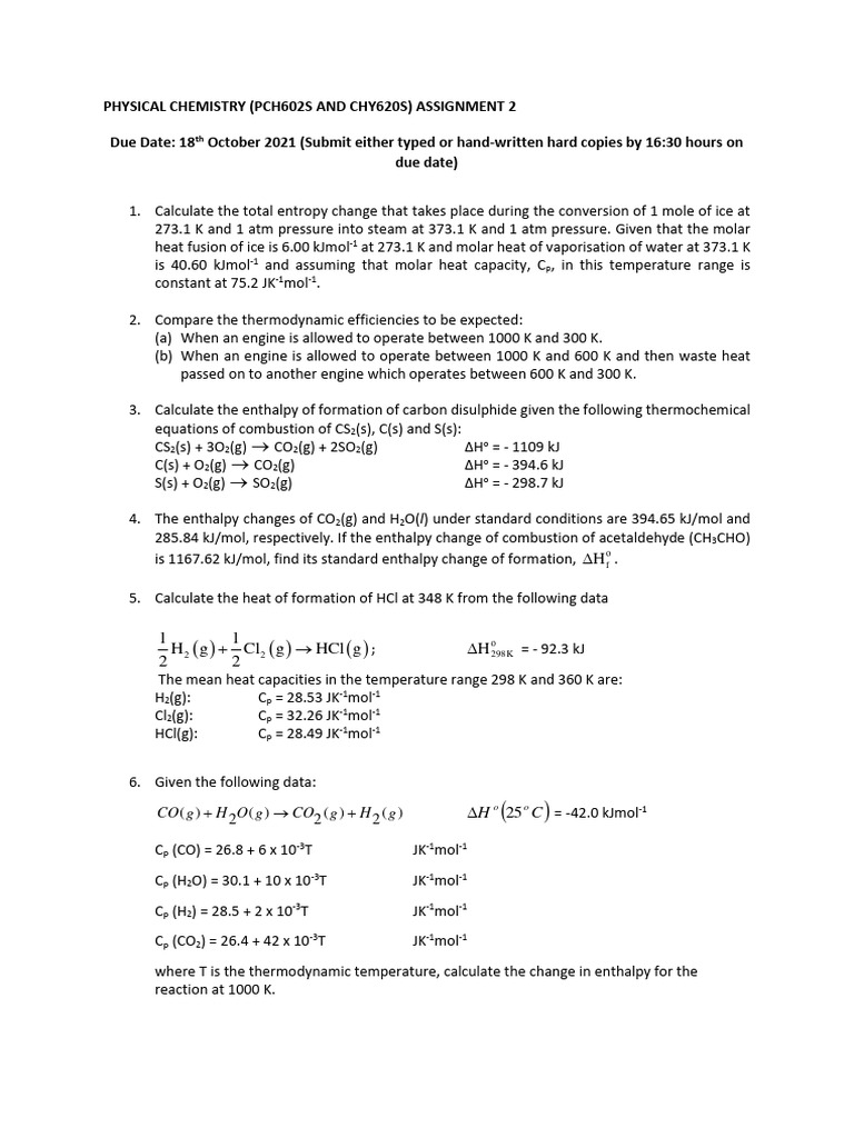 PHYSICAL CHEMISTRY (PCH602S AND CHY620S) ASSIGNMENT 2