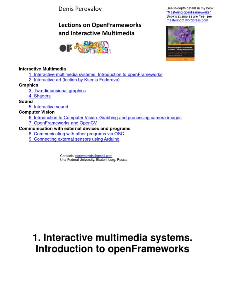 - Basics OpenFrameworks. General principles of real-time systems, vision systems and interactive systems. - 2D-graphics. - Receiving and processing images from the camera, the basics OpenCV. - Receiving and processing of sound. - Generation of sound, the playback of audio samples. - 3D-graphics. - Basic mapping. - Meet with high-level programs Unity3D, MultitouchDesigner, QuartzComposer. Installing Openframeworks connection with them. - Connecting external devices via the Arduino.