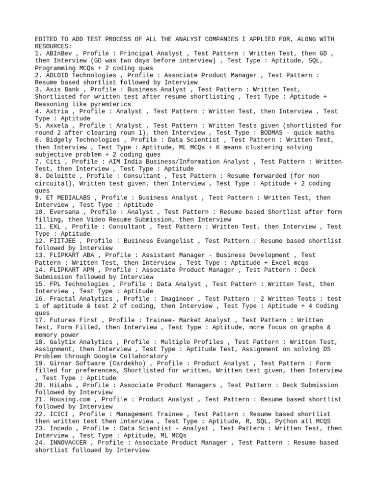 EDITED TO ADD TEST PROCESS OF ALL THE ANALYST COMPANIES I APPLIED FOR, ALONG WITH