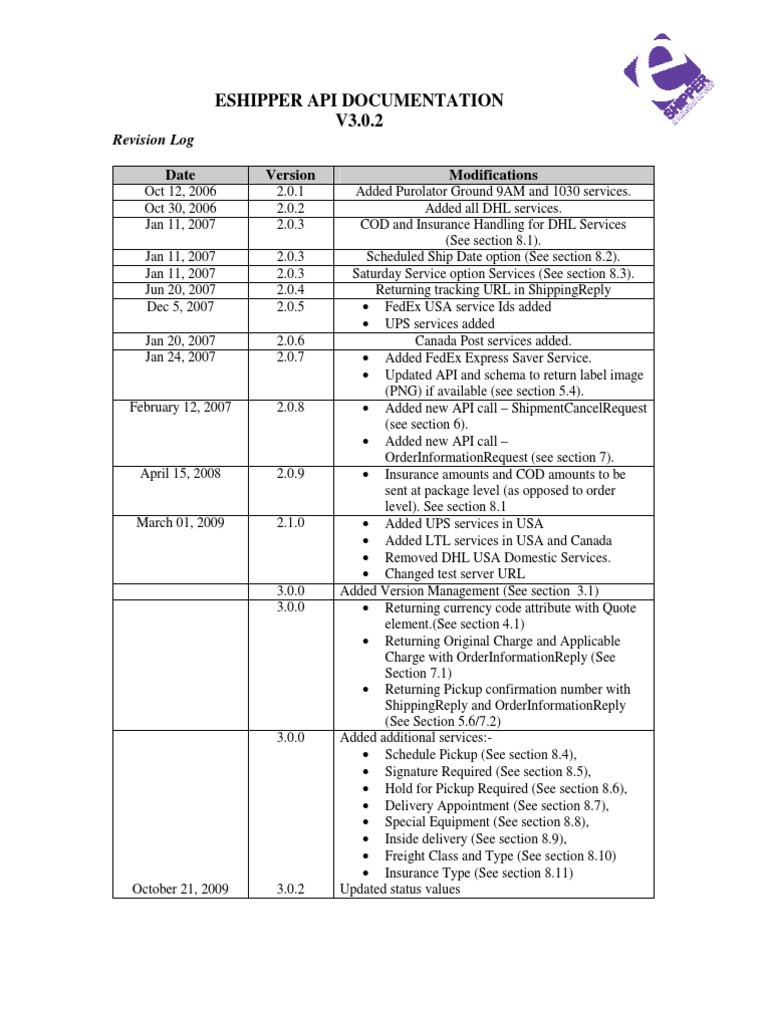 Added Purolator Ground 9AM and 1030 services. Added all DHL services. COD and Insurance Handling for DHL Services (See section 8.1). Scheduled Ship Date option (See section 8.2). Saturday Service option Services (See section 8.3). Returning tracking URL in ShippingReply FedEx USA service Ids added UPS services added Canada Post services added. Added FedEx Express Saver Service. Updated API and schema to return label image (PNG) if available (see section 5.4). Added new API call ShipmentCancelRequest (see section 6). Added new API call OrderInformationRequest (see section 7). Insurance amounts and COD amounts to be sent at package level (as opposed to order level). See section 8.1 Added UPS services in USA Added LTL services in USA and Canada Removed DHL USA Domestic Services. Changed test server URL Added Version Management (See section 3.1) Returning currency code attribute with Quote element.(See section 4.1) Returning Original Charge and Applicable Charge with OrderInformationReply (See Section 7.1) Returning Pickup confirmation number with ShippingReply and OrderInformationReply (See Section 5.6/7.2) Added additional services: Schedule Pickup (See section 8.4), Signature Required (See section 8.5), Hold for Pickup Required (See section 8.6), Delivery Appointment (See section 8.7), Special Equipment (See section 8.8), Inside delivery (See section 8.9), Freight Class and Type (See section 8.10) Insurance Type (See section 8.11) Updated status values
