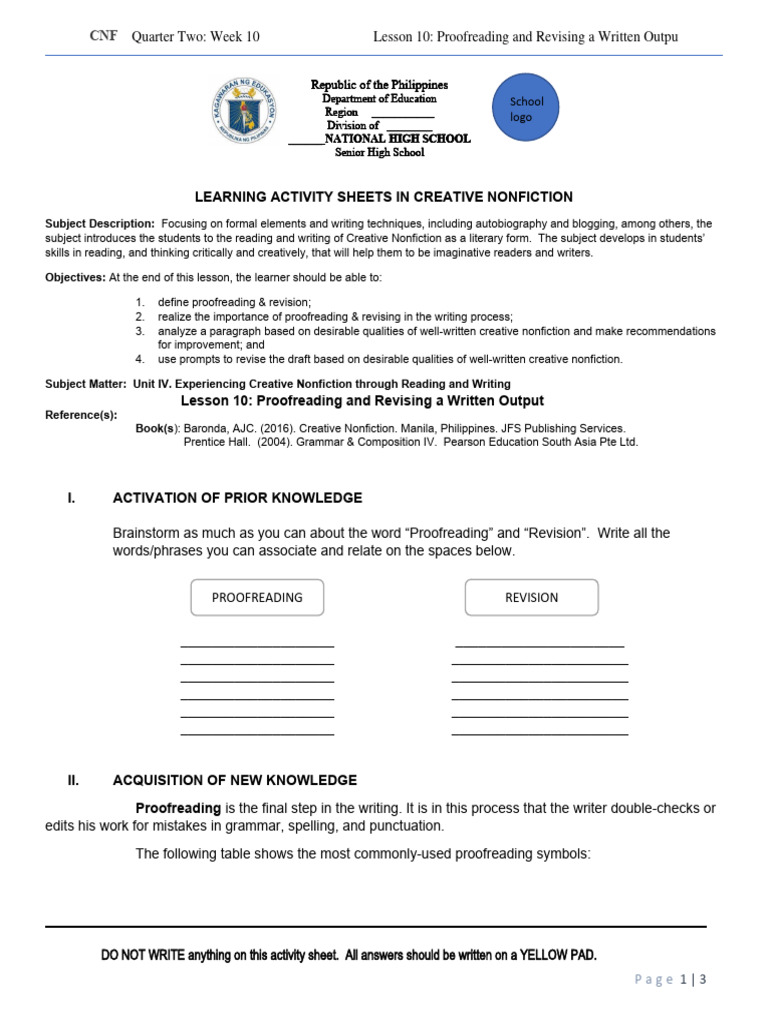 CNF Quarter Two: Week 10 Lesson 10: Proofreading and Revising a Written Output