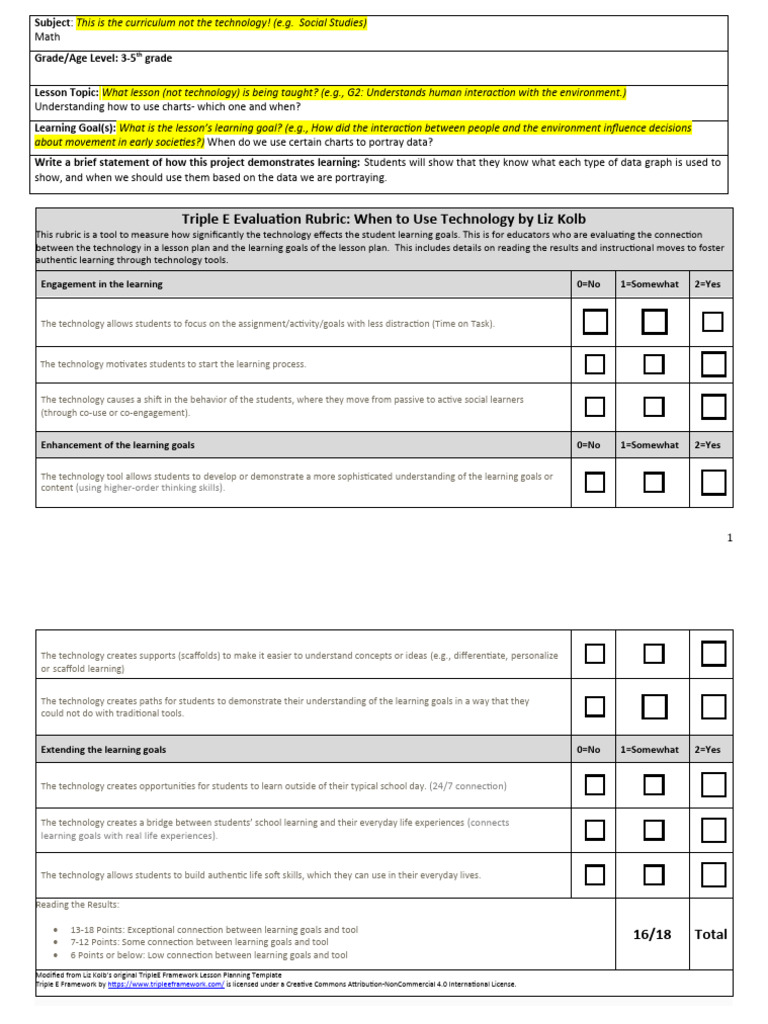 Modified from Liz Kolb’s original TripleE Framework Lesson Planning Template