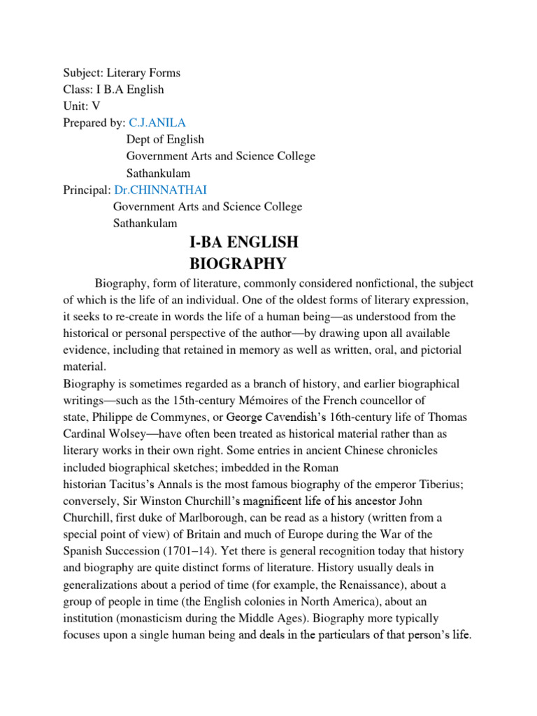 and biography are quite distinct forms of literature. History usually deals in