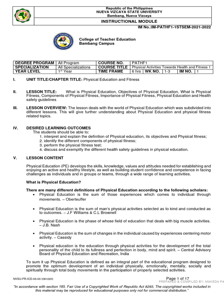 different lessons. This will give further understanding about Physical Education and physical fitness