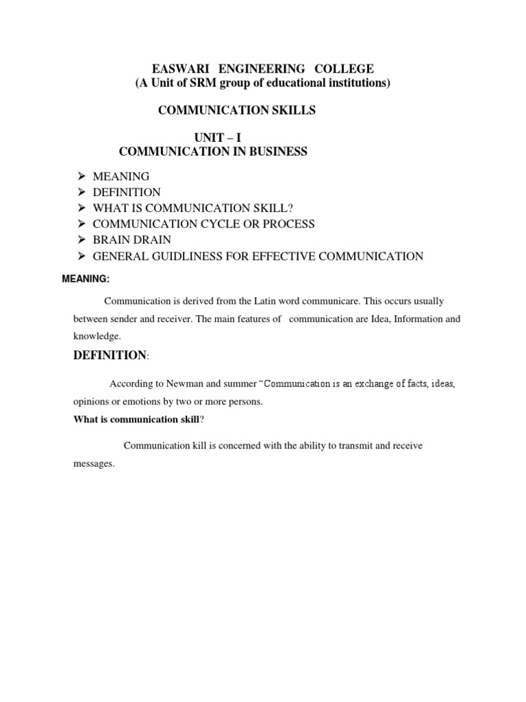 EASWARI ENGINEERING COLLEGE (A Unit of SRM group of educational institutions) COMMUNICATION SKILLS UNIT I COMMUNICATION IN BUSINESS MEANING DEFINITION