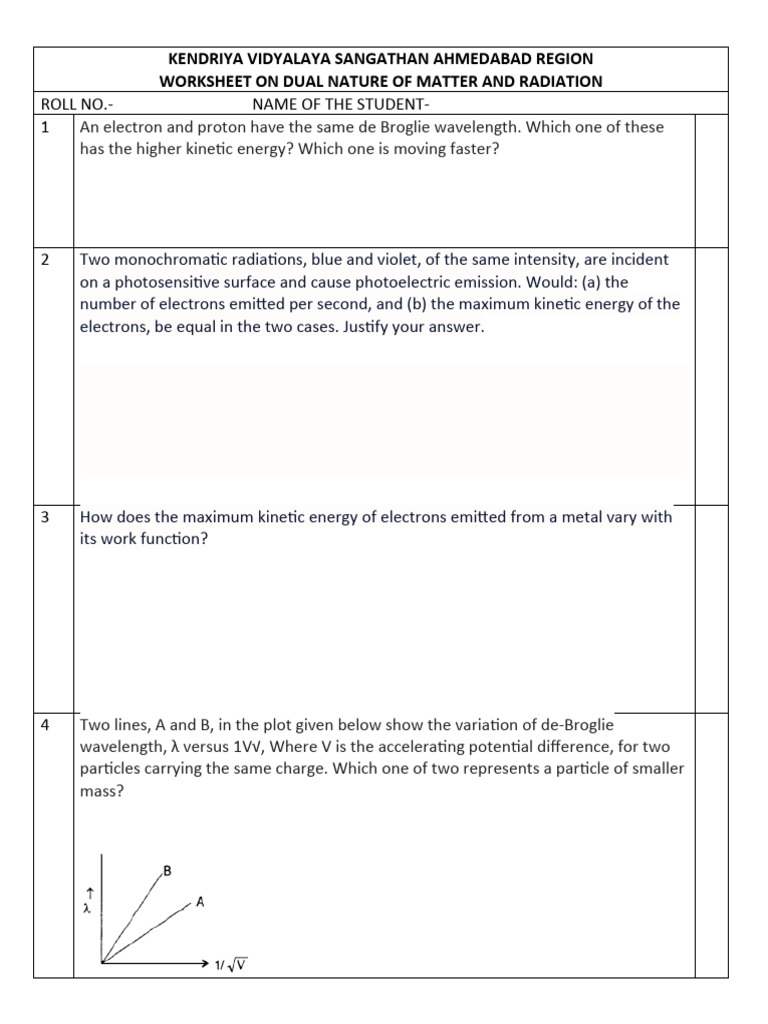 WORKSHEET ON DUAL NATURE OF MATTER AND RADIATION