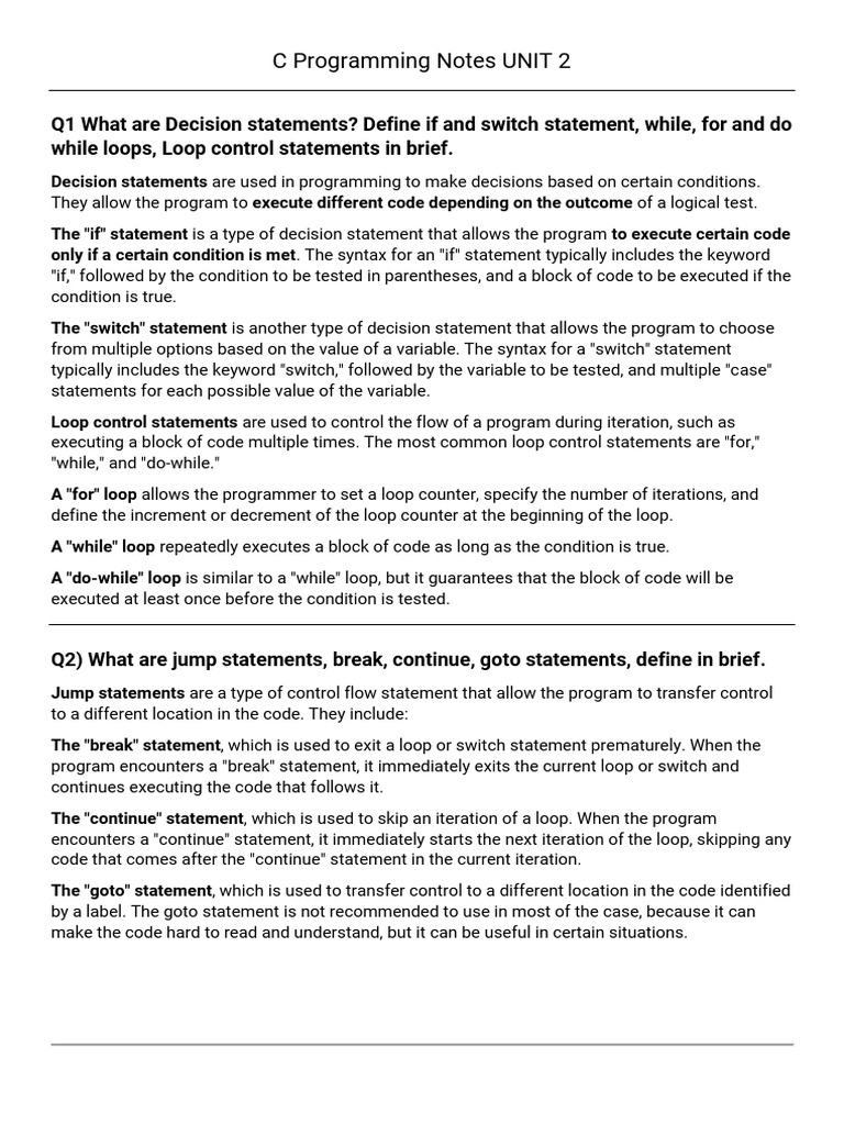 Q1 What are Decision statements? Define if and switch statement, while, for and do