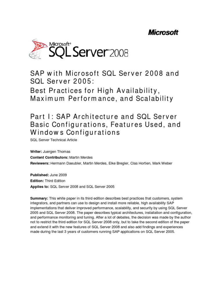 SQL Server Technical Article Writer: Juergen Thomas Content Contributors: Martin Merdes Reviewers: Hermann Daeubler, Martin Merdes, Elke Bregler, Clas Hortien, Mark Weber Published: June 2009 Edition: Third Edition Applies to: SQL Server 2008 and SQL Server 2005 Summary: This white paper in its third edition describes best practices that customers, system integrators, and partners can use to design and install more reliable, high availability SAP implementations that deliver improved performance, scalability, and security by using SQL Server 2005 and SQL Server 2008. The paper describes typical architectures, installation and configuration, and performance monitoring and tuning. After a lot of debates, the decision was made by the author not to restrict the third edition for SQL Server 2008 only, but to take the second edition of the paper and extend it with the new features of SQL Server 2008 and also add findings and experiences made during the last 3 years of customers running SAP applications on SQL Server 2005.