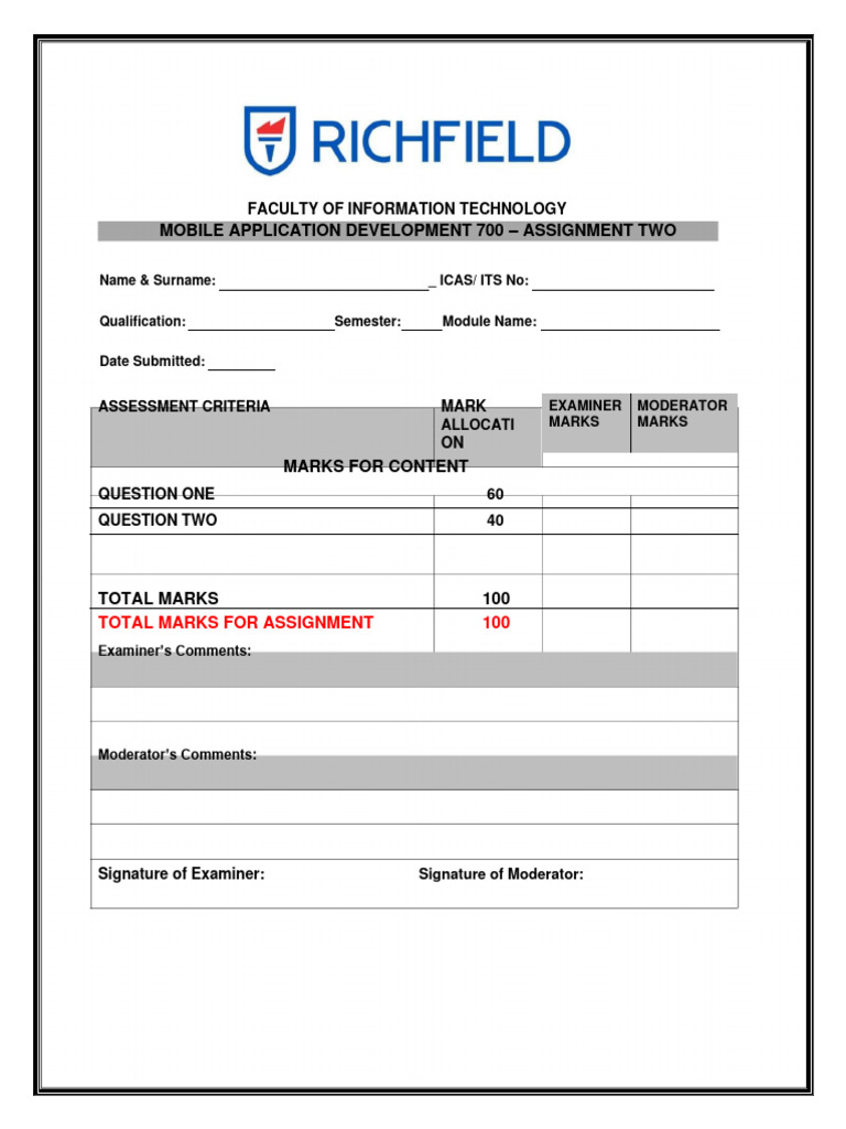 TOTAL MARKS FOR ASSIGNMENT 100