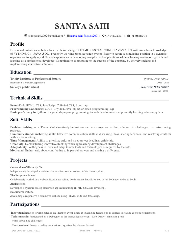 LAST UPDATED: JUNE 28, 2023 saniya sahi · RÉSUMÉ 1/2