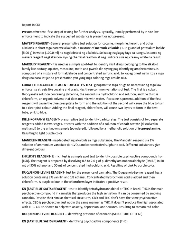 COBALT THIOCYANATE REAGENT OR SCOTT’S TEST- ginagamit sa mga drugs na nacapture ng mga law