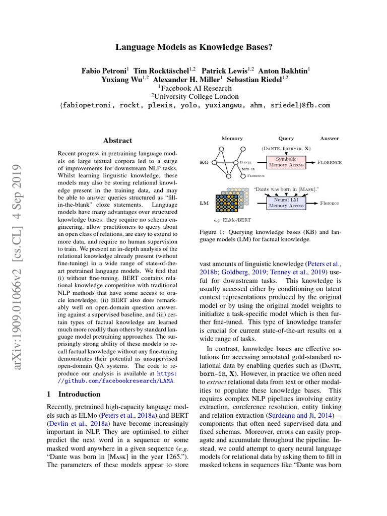 whether these models can compete with traditional We introduce the LAMA (LAnguage Model Anal-