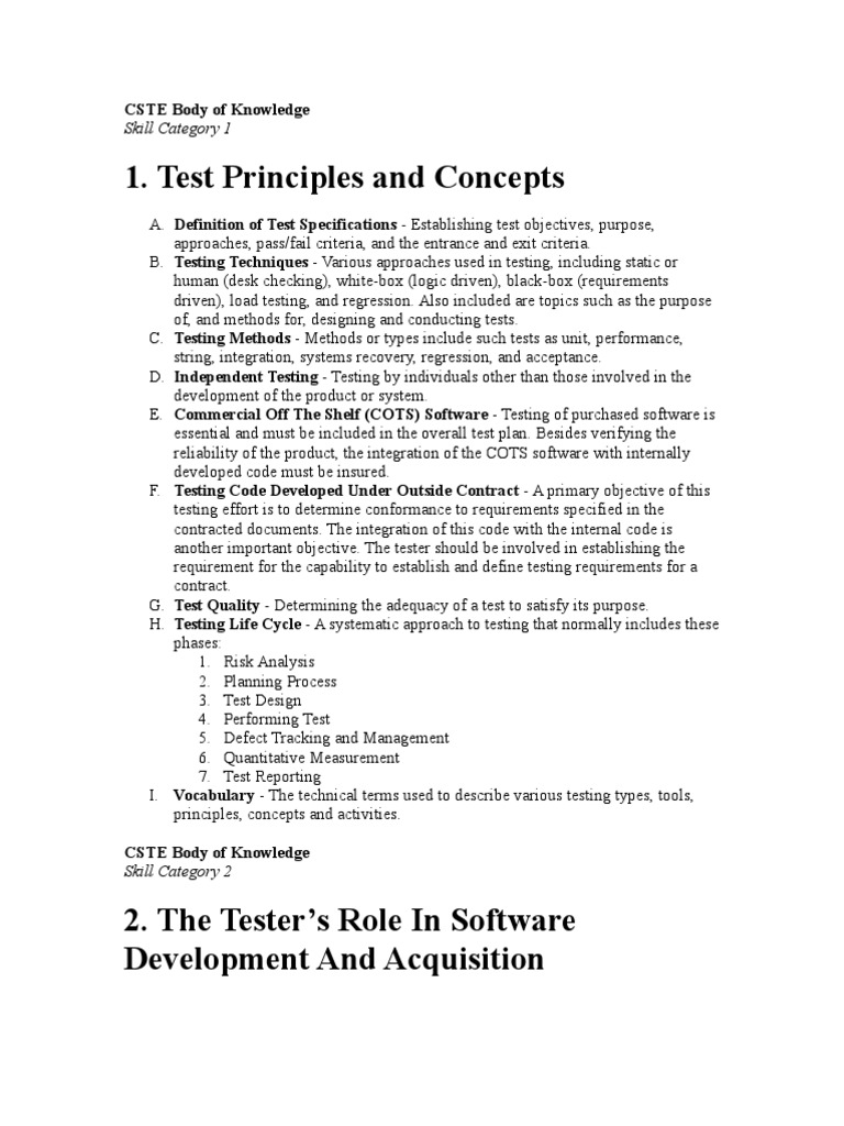 C. Testing Methods - Methods or types include such tests as unit, performance,